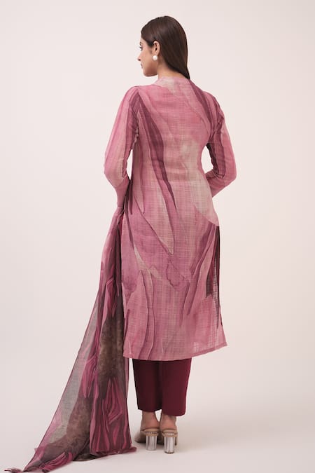 Mulberry pink printed kurta featuring a straight silhouette and V-neckline. Paired with solid mulberry purple pants and a matching dupatta.