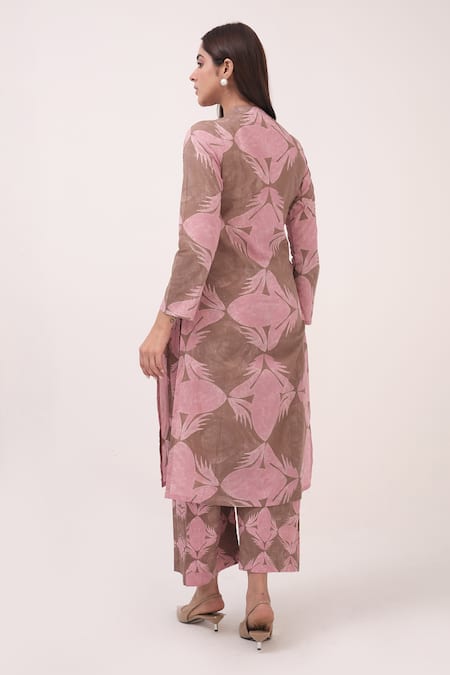 Pink and brown printed straight kurta featuring a V-neck and long sleeves. Paired with matching printed wide-leg pants.