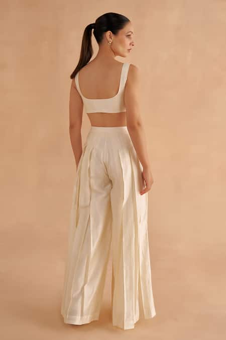 White scoop neck blouse in chiniya silk paired with flared pleated pant. The set features a relaxed fit for comfortable wear.