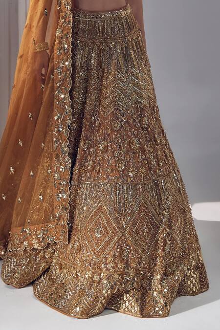 Gold embroidered lehenga featuring intricate sequin, bead, and salli work. Paired with a padded blouse adorned with crystal detailing and tassel drops, along with an embroidered border dupatta showcasing scattered booti work.