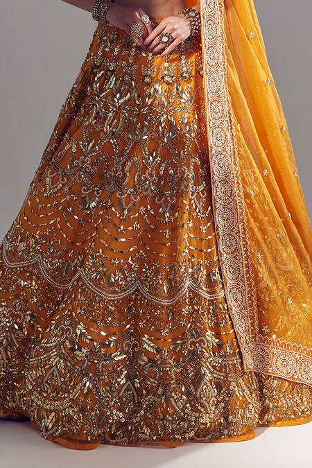 Orange Silk, Net Pearls, Sequins, Beads Plunge Neck Embroidered Lehenga Set