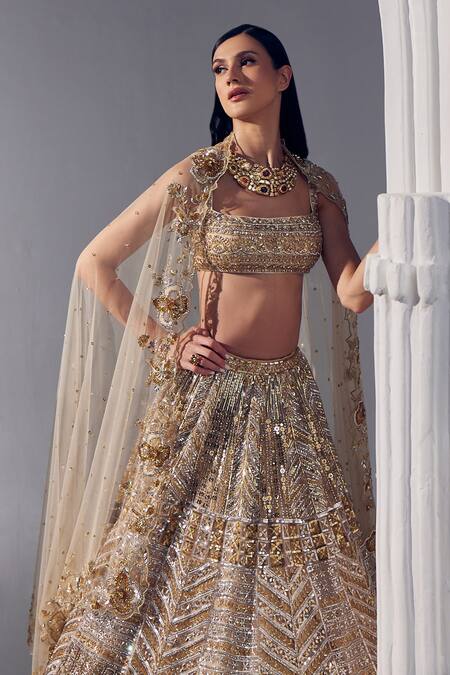 Gold lehenga featuring all-over sequin and bead embroidery with an attached cancan. Paired with a padded embroidered blouse and a net dupatta with cutwork hem and Swarovski detailing.