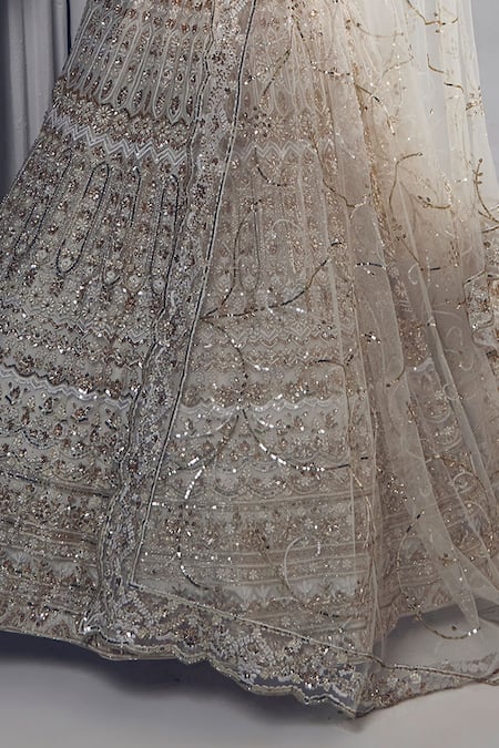 Ivory Silk, Net, Cotton Sequins, Pearls, Beads Thread Embroidered Lehenga Set