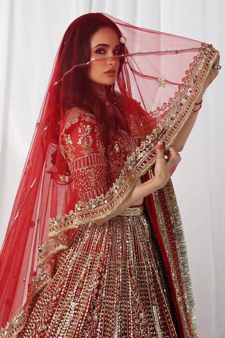 Red lehenga featuring zardozi, sequin, and nakshi embroidery throughout. Paired with an embroidered padded blouse and an embroidered sheer dupatta with a coordinating trail.