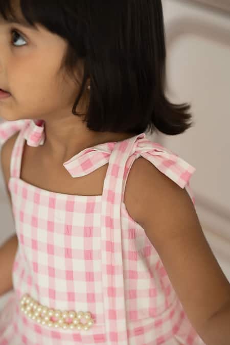 Pink Cotton Pearls Barbie Checkered Pattern Dress