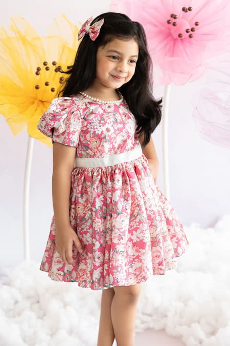 Pink dress featuring puffed sleeves, pearl embellished neckline, and a sequin embroidered waistband