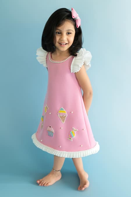 Baby pink A-line dress featuring frilled flutter sleeves and pearl lining on the neckline