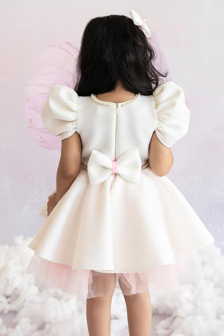 White & pink puffed sleeves layered dress featuring carousel embroidery on the bodice