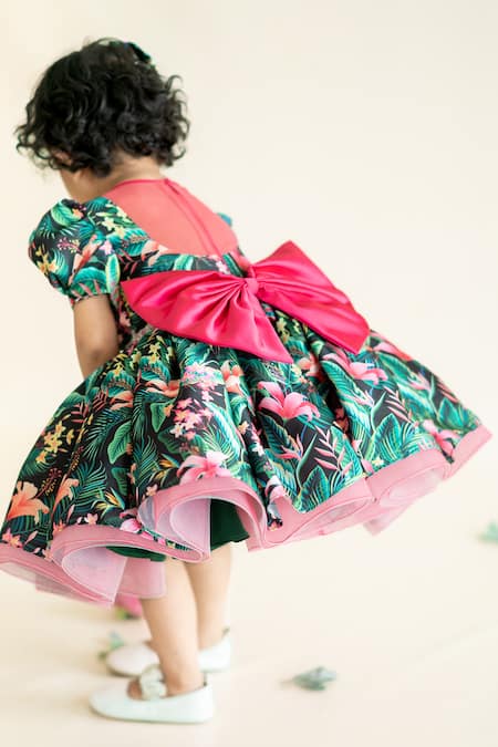 Green Tulle, Linen Sequins Floral Tropical Print Dress