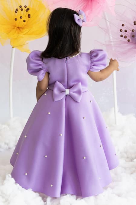 Lavender high low gown featuring puffed sleeves and princess kingdom motif embroidery