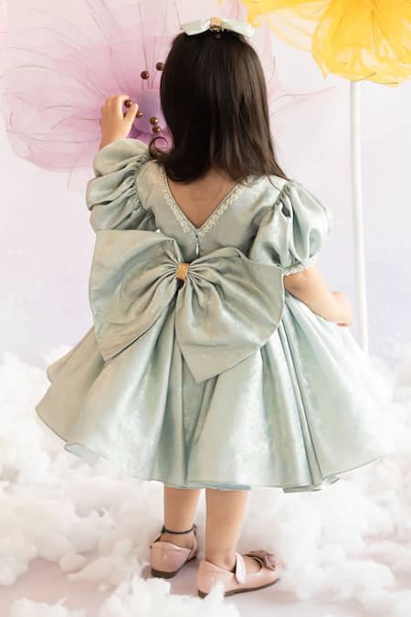 Sea life embroidery with sequins and pearls, Large bow detail at the back, Puffed sleeves with embellishments