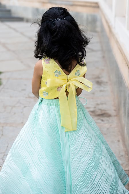 Mint green lehenga featuring textured pleated organza fabric. Paired with a floral embroidered blouse adorned with sequins and beads, complemented by a cape style dupatta.