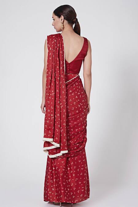 Red modal blend pre-stitched saree featuring bandhani print and crochet lace detailing. Accompanied by a stitched blouse with a V-neckline and sleeveless design.