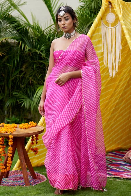 Hot pink organza saree with hand-dyed leheriya detail & sequin scallop border. Comes with unstitched blouse bandhani fabric.