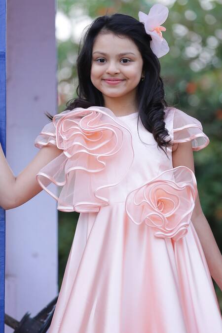Peach dress with 3D floral ruffle & flounce hem detail. Comes with hair accessorie.