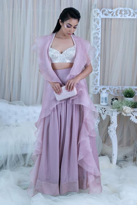 Onion pink long ruffle jacket with sequin embroidered trim border. Comes with matching lehenga and silver bustier top.