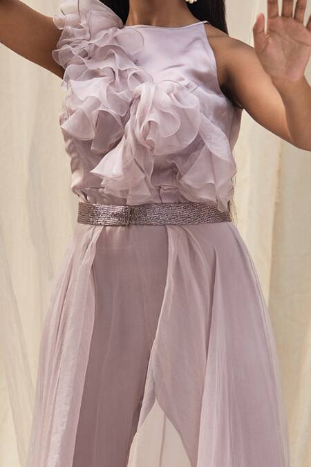 Purple Organza, Satin Lurex Plain Round Ruffle Jumpsuit
