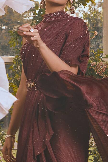 Deep wine pre-draped saree with scattered embroidery & ruffle border. Paired with embroidered blouse & embroidered belt.