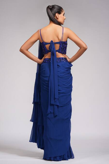 Navy blue pre-draped saree with ruffle pattern. Paired with pearl, sequin embroidered blouse & belt.
