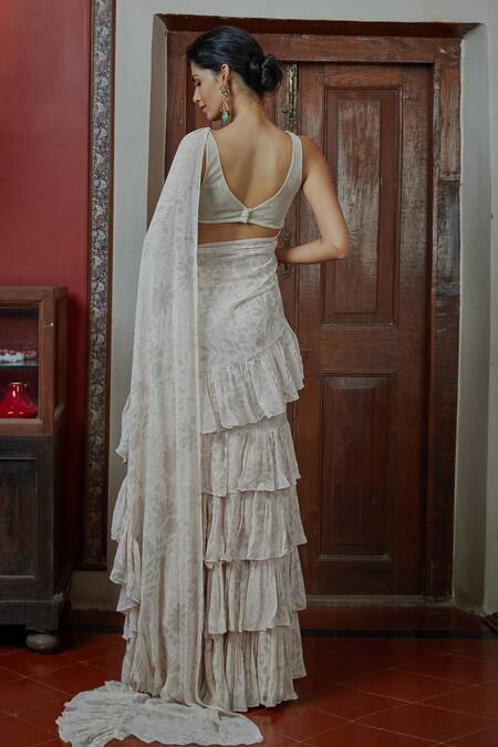 Cream ruffle saree featuring a floral pattern and back cut-out. Paired with a V-neck embroidered blouse.