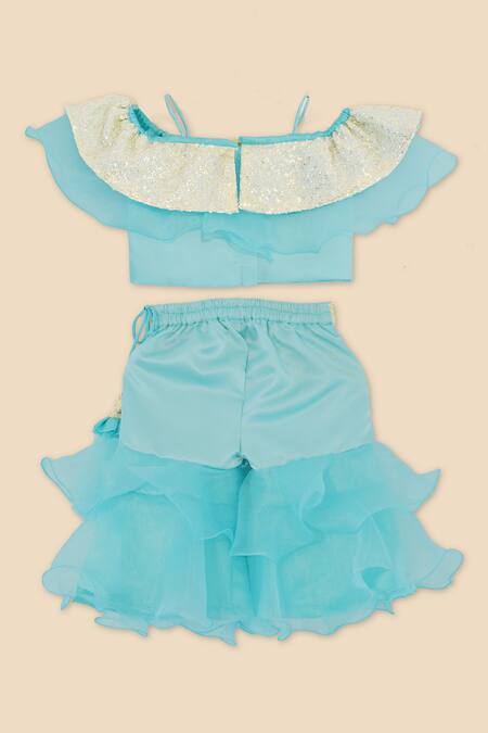Blue Crepe Satin Embroidered Sequins Ruffle Sharara Set