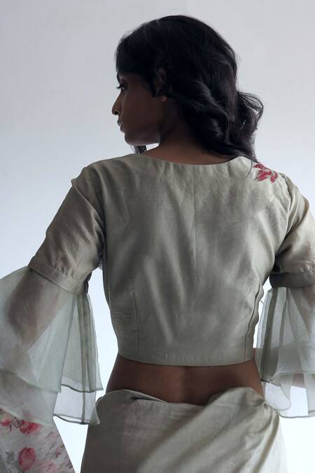 Shop_Shorshe Clothing_Green Chanderi Ruffle Sleeve Blouse_at_Aza_Fashions
