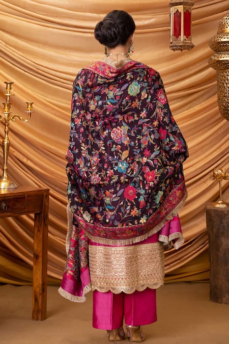 Fuchsia straight kurta featuring embroidered daman & Swarovski round neckline with hand made rose button. Paired with pant & multi colored banarasi handwoven kani odhani.