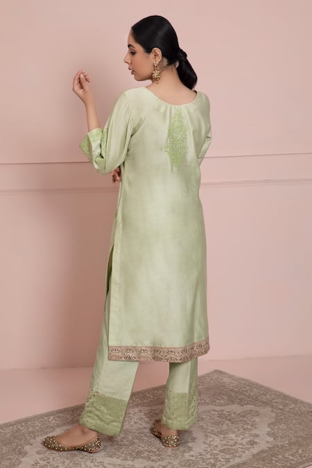 Green Chanderi V Neck Chikankari Kurta And Pant Set