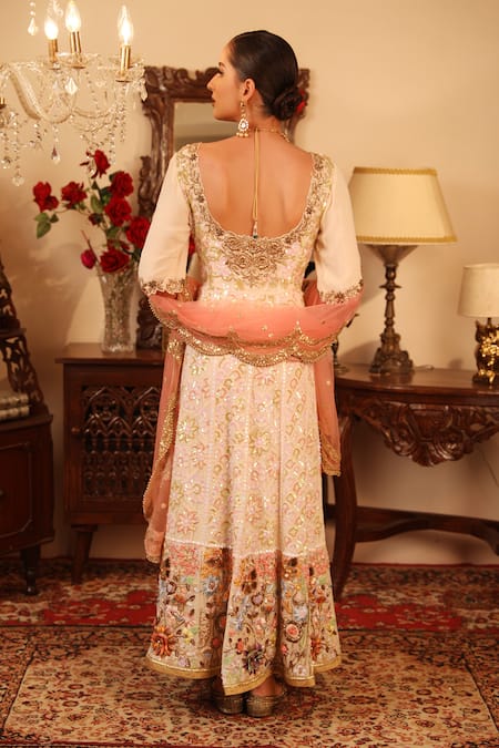 Ivory anarkali highlighted with heavy chikankari hand embroidery, notched neckline and elbow sleeveless. Comes with churidar and peach dupatta.