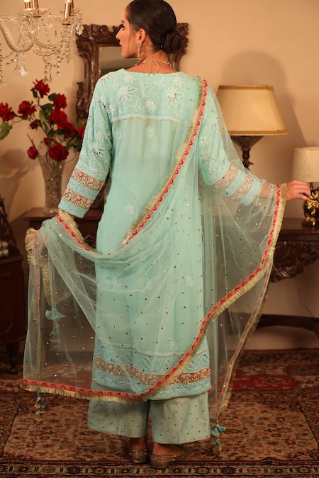 Bluish green kurta highlighted with intricate chikankari-hand embellishments, round neckline and straight silhouette. Comes with pant and dupatta.