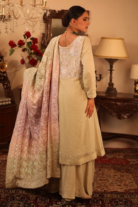 Green kurta highlighted with chikankari-sequin embroidery, boat neckline, full sleeves and straight silhouette. Comes with gharara and dupatta.
