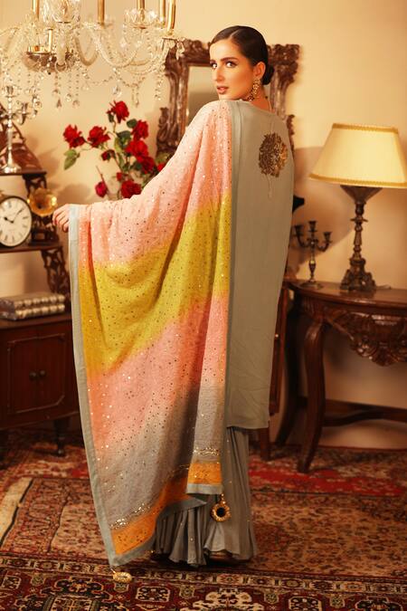 Grey A-line highlighted with chikankari-sequin embroidery, round neckline, full sleeves and straight silhouette. Comes with sharara, inner slip and dupatta.