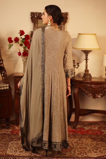 Greyish-green anarkali highlighted with heavy chikankari embroidery, lapel neckline and full sleeves. Comes with pant, inner slip and dupatta.