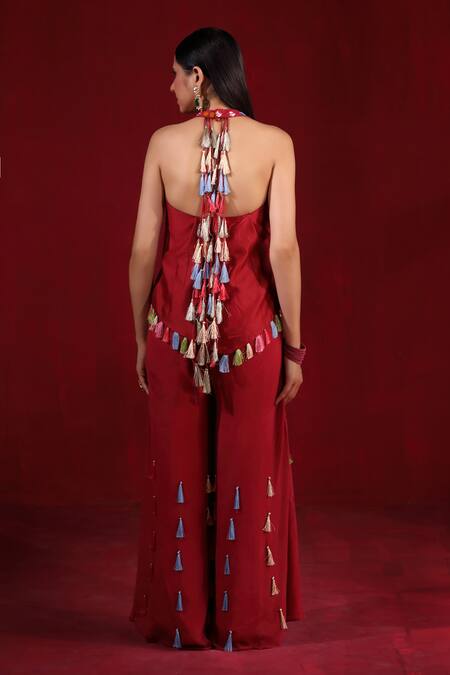 Maroon red halter neck top featuring multi color thread, bead & sequin hand embroidery. Paired with flared sharara adorned with multi color drop tassel details.