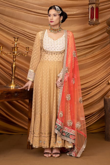 Beige banarasi anarkali with ivory yoke, chikankari ghera, embroidered with zari, cutdana & stones. Comes with coral shaded net dupatta with zari buttas.
