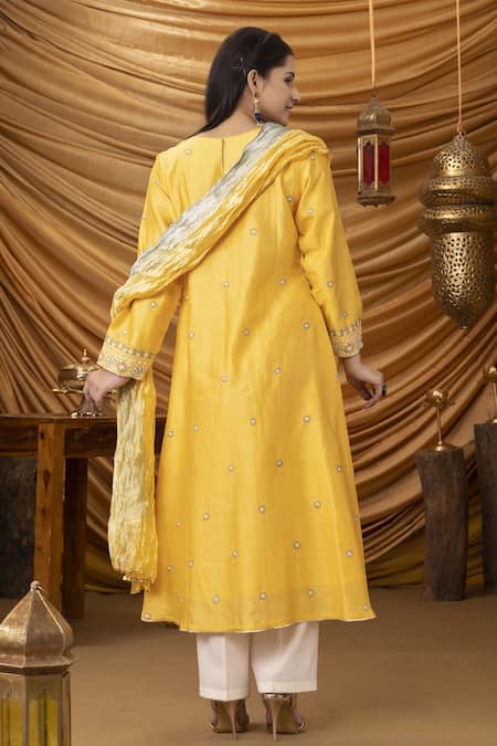 Mango yellow A-line kurta with hand embroidered chikankari & handmade pearl buttons. Paired with crinkled ombre shaded cotton silk dupatta & pant.