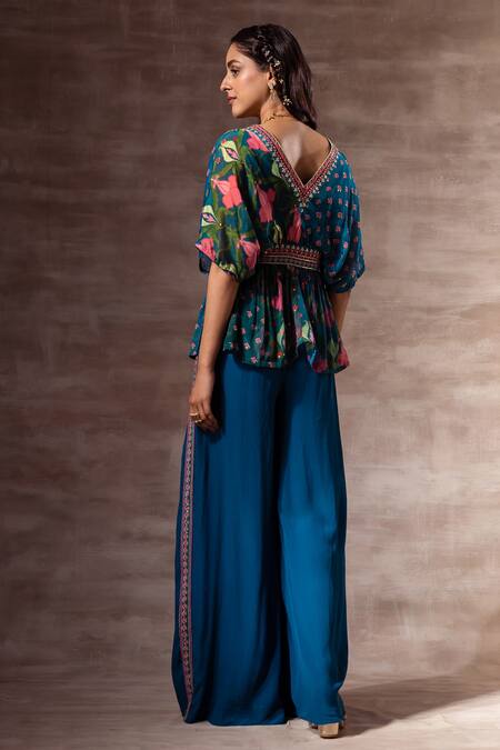 Blue Crepe Thread Work Embroidered Side Palazzo