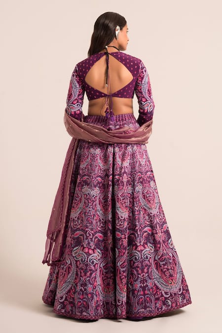 Ink purple lehenga featuring floral and paisley patterns with sequin and salli work. Paired with a floral pattern embellished blouse and a matching dupatta.