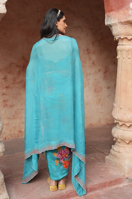 Aqua blue hand embroidered cape with sequin, bead hand embroidery & scalloped cut work hem.