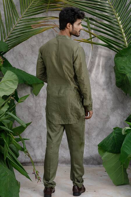 Olive shirt style kurta in crushed texture with embroidered flaps & collar. Paired with pyjama pant.