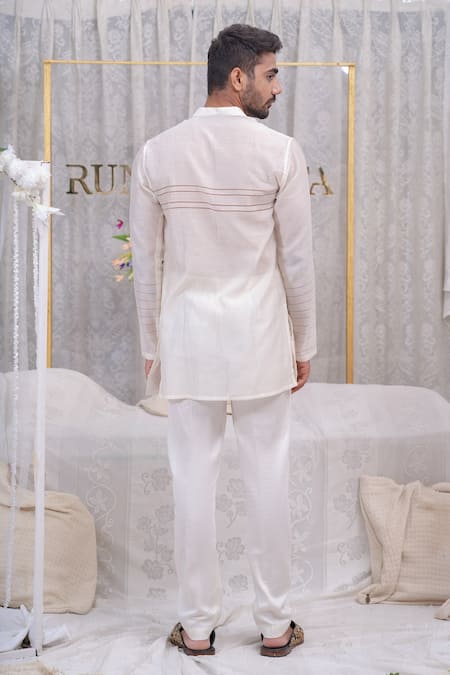 Ivory shirt style kurta detailed with hand pulled weaves placed in different segments. Paired with pyjama pant.
