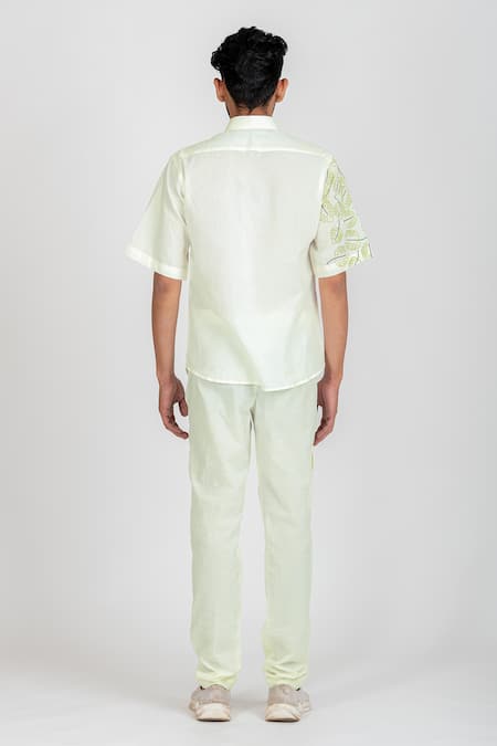 White Enzyme Washed Cotton Thread Work Monstera Leaf Embroidered Shirt
