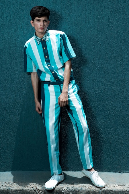 Turquoise shirt featuring all-over stripes, lace collar, and front button placket. Paired with matching striped pants equipped with side pockets and belt loops.