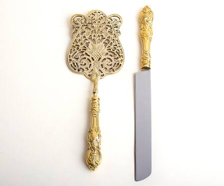 Gold, silver cake server set, handcrafted in stainless steel & brass, features a knife and server, detailed by engraving on the handle.