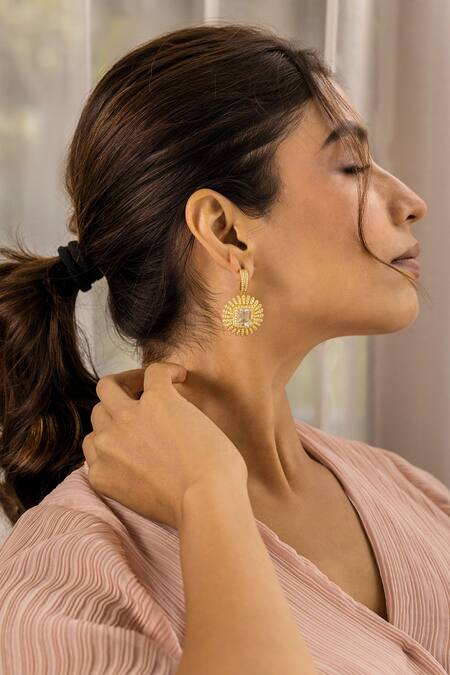 Gold danglers featuring AAA quality cubic zirconia and natural prasiolite
