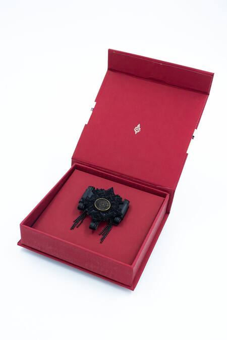 Black handcrafted brooch featuring antique chains and faux leather detailing
