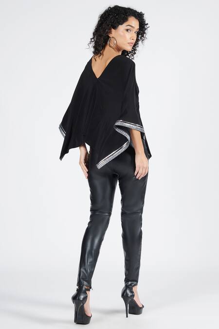 Black asymmetric cape top featuring a V neck and angel sleeves