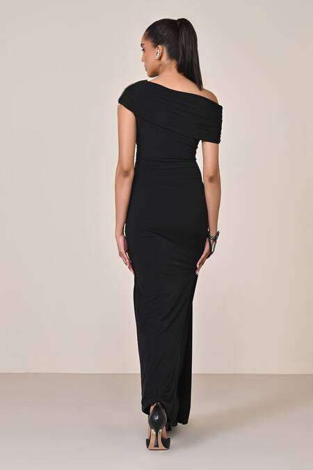 Black draped gown featuring an asymmetric neckline with one shoulder sleeve