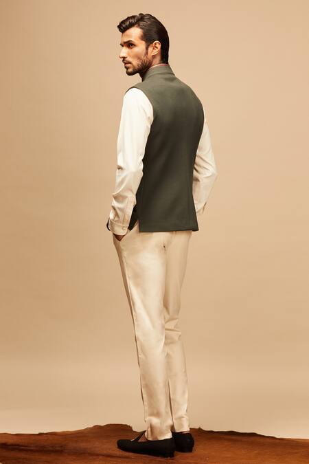 Millitary green Nehru jacket with metallic front buttons & contrast tape detailing.