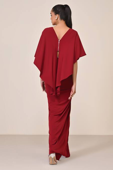 Cherry draped gown featuring cutdana and sequin embellishments with a waist cut-out detailing